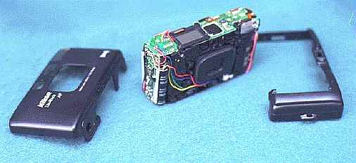 The top/back clamshell will still be held with little catches. Slightly tilt out and up the right side, and the center portion of the left side. Once both sides are free, the entire top shell is tilted up and will fall free. The front clamshell is carefully tilted out from the top. Be gentile, as it can catch on some wires. Once you have separated the camera into its three basic parts, the fun begins.