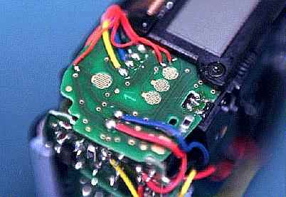 Use as small a soldering iron as you can. Mine is an UNGARmatic soldering station designed for printed board work, and it was still too large to easily control. Tin the wire terminus and the prepared trace, apply a little solder flux to the wire, mate the two and briefly apply the iron to bond them. This is precarious work, and it was the only time that I was concerned that I'd damage the camera. However, I was overly concerned and the operation was completely successful. Just proceed slowly and carefully and you too will be successful. Once you've connected the three wires to the "focus", "shutter" and "common" contacts, as shown in figure 3, you are ready to prepare the baseplate electrical contacts for connection to the other end of the wires.