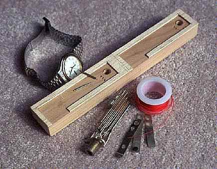 The base has three spring loaded electrical plungers, for each camera, to establish electrical continuity with the bronze contacts when the cameras are mounted upon the mount. Spring loaded plungers were utilized so as to provide a good electrical connection while simultaneously reducing some of the assembly precision. The necessary plungers are easy to obtain. I simply went to a local department store's watch department and asked for six identical watchband retainers. They should be free, as these are removed from customer's watches when new bands are attached, and most stores have an accumulation of the old retainers. The retainers that I chose were plated brass, which would be easier to solder than stainless steel retainers. Fortunately, the plated brass retainers outnumber the stainless ones. Tin one end of each plunger contact with solder.