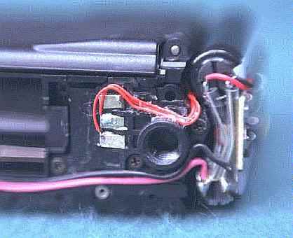 Group the three wires and route them to the tripod mount area of the camera base. You will need to tuck them behind the flash capacitor, as can bee seen in figure 5. As you bend and tuck the wires, tack them in place with a few drops of Duco cement.