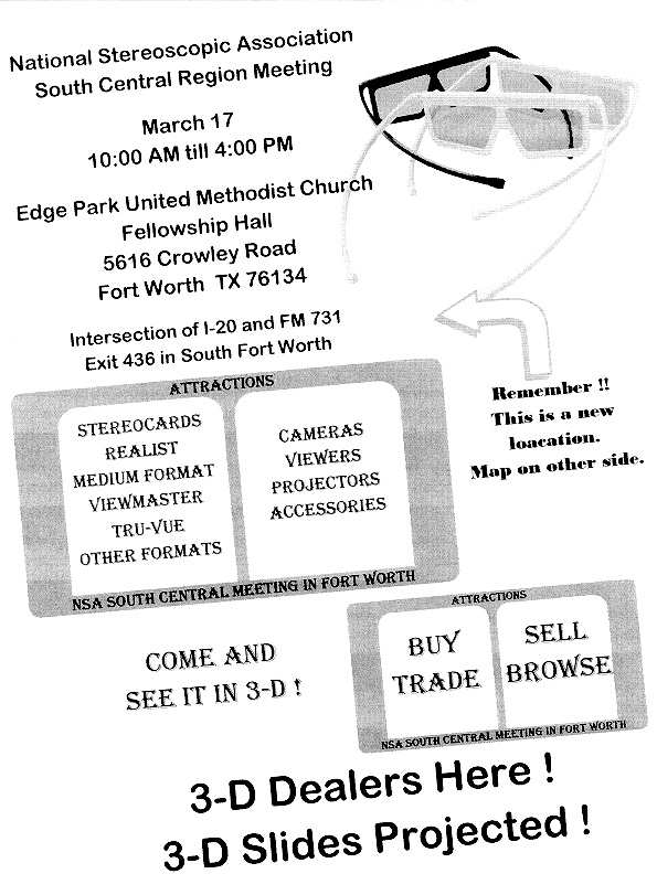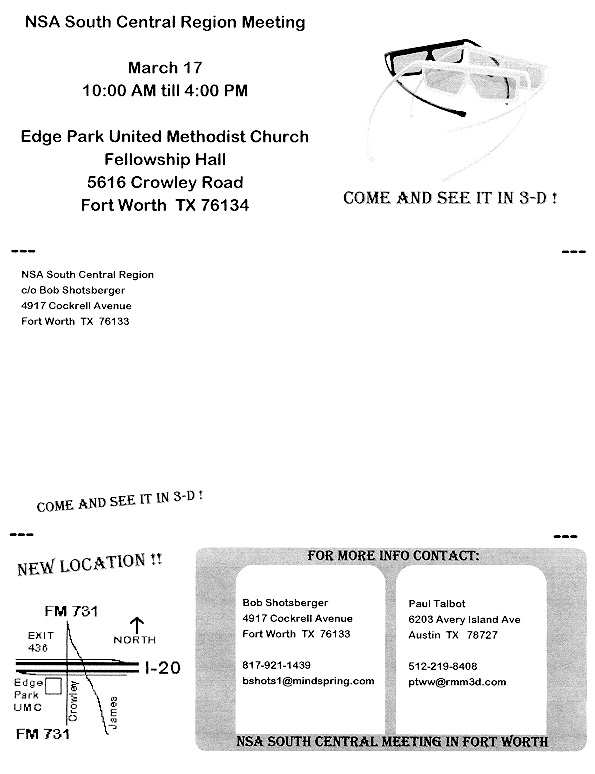 The next NSA SCR meeting event will be May 5, 2001 in Austin Texas with a special guest appearance by Jon Golden of 3D Concepts!
