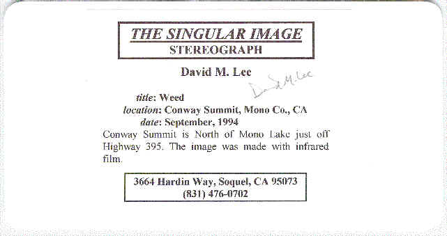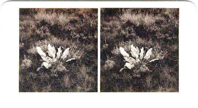 This print was sepia toned. This weed was actually dried up, by the way. The foliage does not have to be living in order to reflect IR. The camera separation was 4 inches.