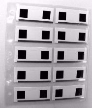 (20k jpeg)Our custom-manufactured slide storage pages made from 10-mil polypropylene are the best way to keep your slides safe! The pages are 3-hole punched to store in a binder, or they may be hung in a filing cabinet. The frosted back allows easy freeviewing by holding the page up to almost any light source! Each page holds 10 Realist format (1-5/8”x 4”) mounted slides). Perfect for cardboard or RBT-mounted slides! New! For your convenience, we now also stock slide storage pages for your mounted twin 2x2 stereo pairs--also great for all storing your cut but umounted slide chips!
